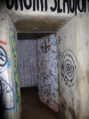 She also saw white graffiti on the white wall broken by the white door having no jambs or cracks, only a knob and the words: “Hey you!” with an arrow —>